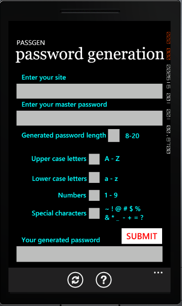 Your generated password. The same set of Site, Master Password, Length and Check Boxes will always generate the same password. Now you don't have to remember all those passwords, PassGen will generate them for you.